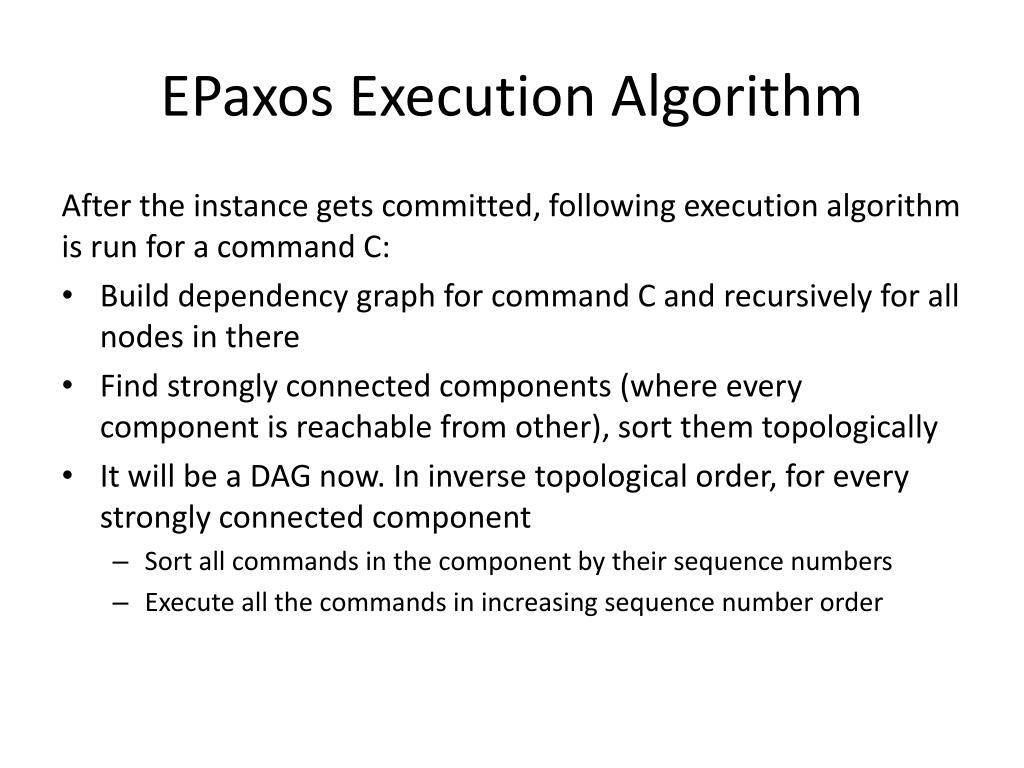 EPaxos Execution Algorithm After the instance gets committed, following execution algorithm is run for a command C: • Build dependency graph for command C and recursively for all nodes in there • Find strongly connected components (where every component is reachable from other), sort them topologically • It will be a DAG now. In inverse topological order, for every strongly connected component • Sort all commands in the component by their sequence numbers • Execute all the commands in increasing sequence number order