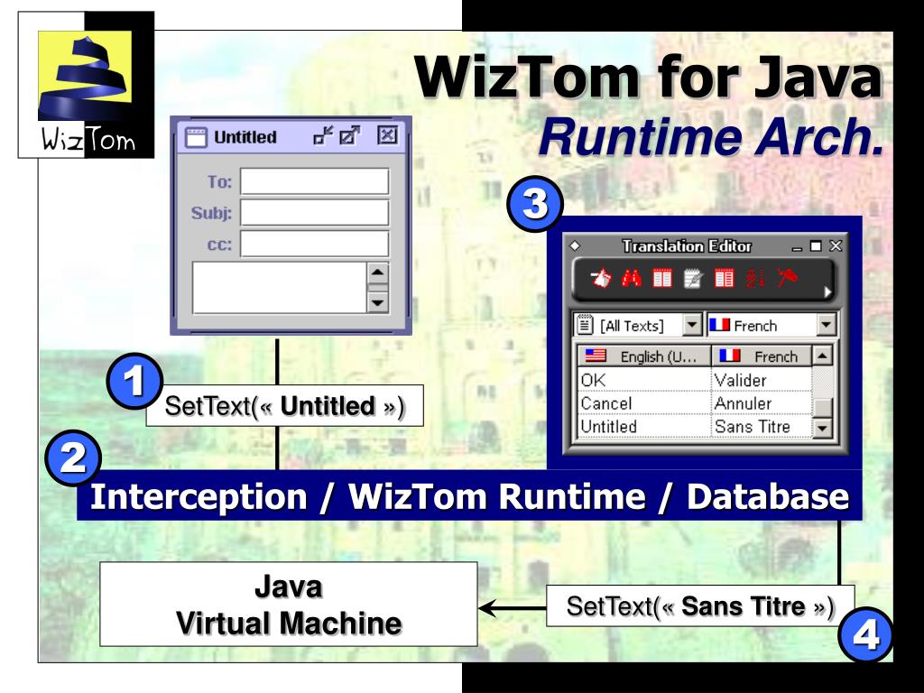 WizTom for Java 3 1 SetText(« Untitled ») Java Virtual Machine SetText(« Sans Titre ») 4 Runtime Arch. 2 Interception / WizTom Runtime / Database