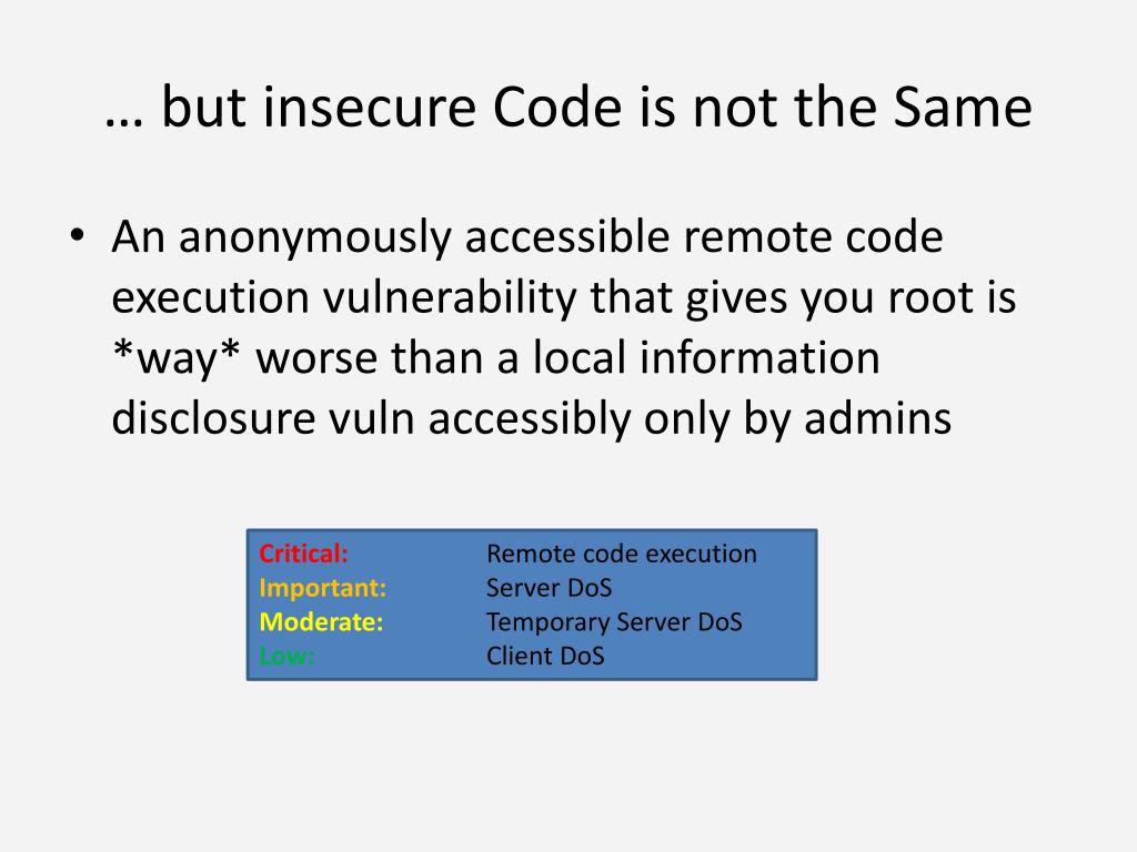 … but insecure Code is not the Same • An anonymously accessible remote code execution vulnerability that gives you root is *way* worse than a local information disclosure vuln accessibly only by admins Critical: Remote code execution Important: Server DoS Moderate: Temporary Server DoS Low: Client DoS