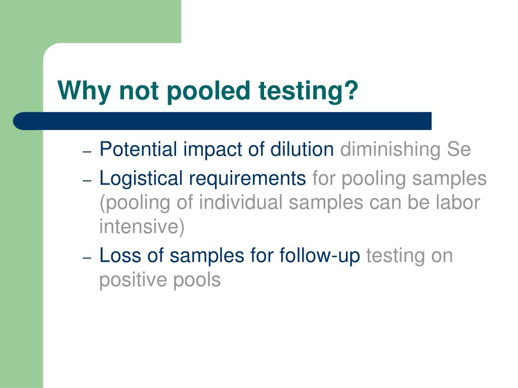 Why not pooled testing? • Potential impact of dilution diminishing Se • Logistical requirements for pooling samples (pooling of individual samples can be labor intensive) • Loss of samples for follow-up testing on positive pools