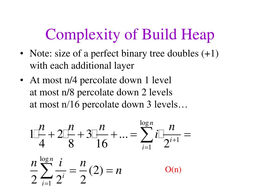 Complexity of Build Heap • Note: size of a perfect binary tree doubles (+1) with each additional layer • At most n/4 percolate down 1 levelat most n/8 percolate down 2 levelsat most n/16 percolate down 3 levels… O(n)