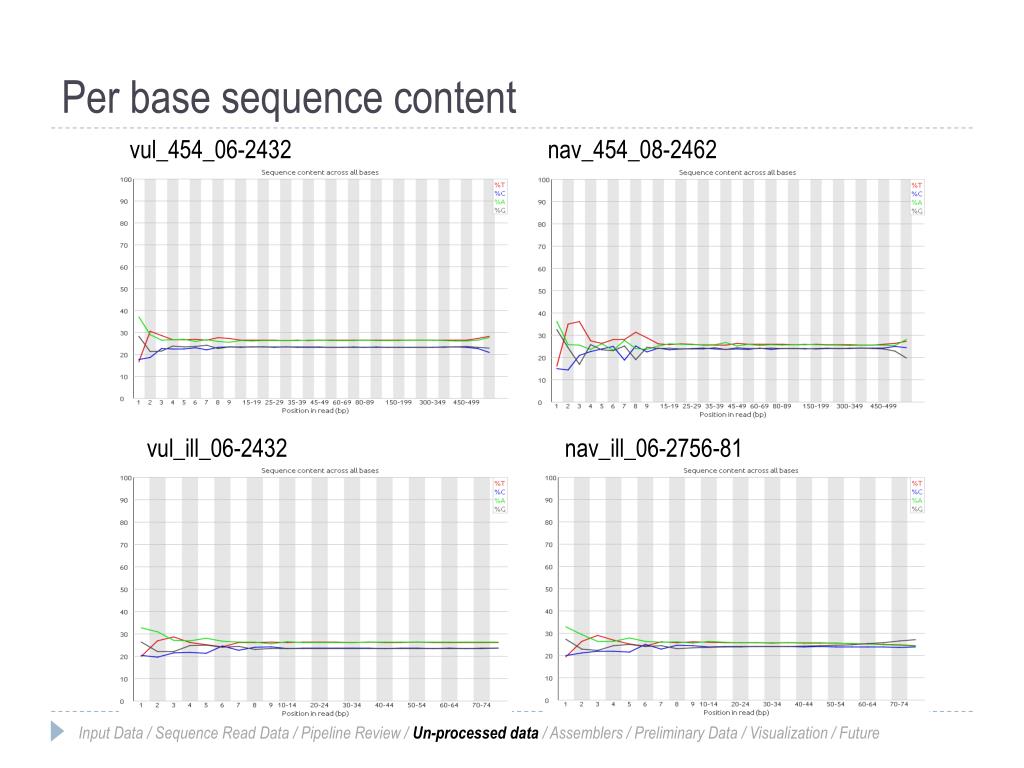 Per base sequence content vul_454_06-2432 nav_454_08-2462 vul_ill_06-2432 nav_ill_06-2756-81 Input Data / Sequence Read Data / Pipeline Review / Un-processed data / Assemblers / Preliminary Data / Visualization / Future