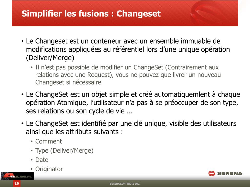Simplifier les fusions : Changeset • Le Changesetest un conteneur avec un ensemble immuable de modifications appliquées au référentiellorsd’une unique opération (Deliver/Merge) • Il n’est pas possible de modifier un ChangeSet (Contrairement aux relations avec une Request), vous ne pouvezquelivrer un nouveau Changesetsinécessaire • Le ChangeSetest un objet simple et crééautomatiquemlent à chaqueopérationAtomique, l’utilisateurn’a pas à se préoccuper de son type, ses relations ou son cycle de vie … • Le ChangeSetestidentifié par uneclé unique, visible des utilisateursainsique les attributssuivants : • Comment • Type (Deliver/Merge) • Date • Originator SERENA SOFTWARE INC.