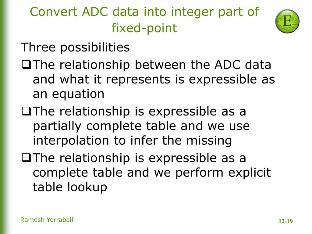 Convert ADC data into integer part of fixed-point Three possibilities • The relationship between the ADC data and what it represents is expressible as an equation • The relationship is expressible as a partially complete table and we use interpolation to infer the missing • The relationship is expressible as a complete table and we perform explicit table lookup Ramesh Yerraballi