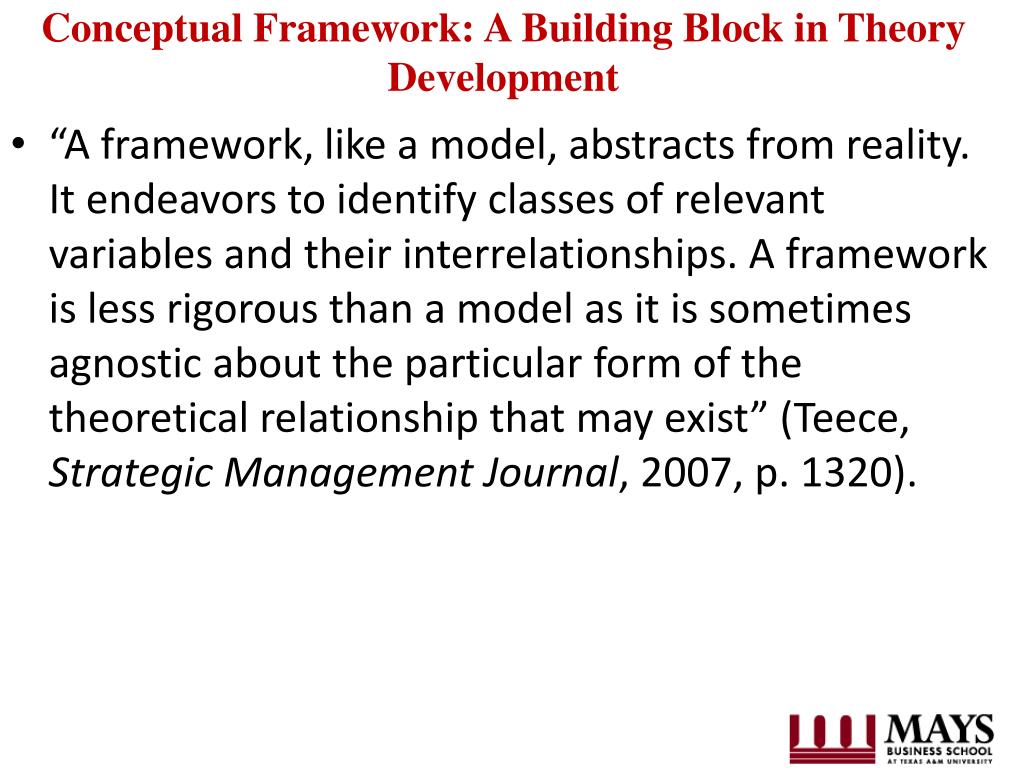 Conceptual Framework: A Building Block in Theory Development • “A framework, like a model, abstracts from reality. It endeavors to identify classes of relevant variables and their interrelationships. A framework is less rigorous than a model as it is sometimes agnostic about the particular form of the theoretical relationship that may exist” (Teece, Strategic Management Journal, 2007, p. 1320).