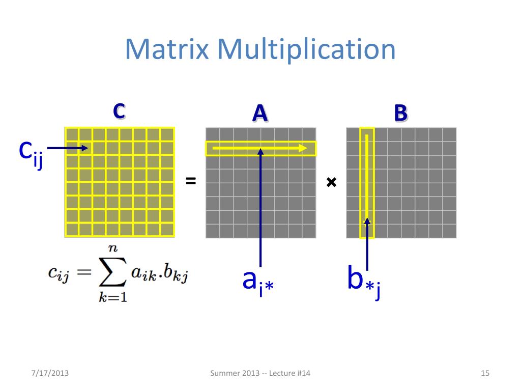 Matrix Multiplication C A B cij = × ai* b*j Summer 2013 -- Lecture #14