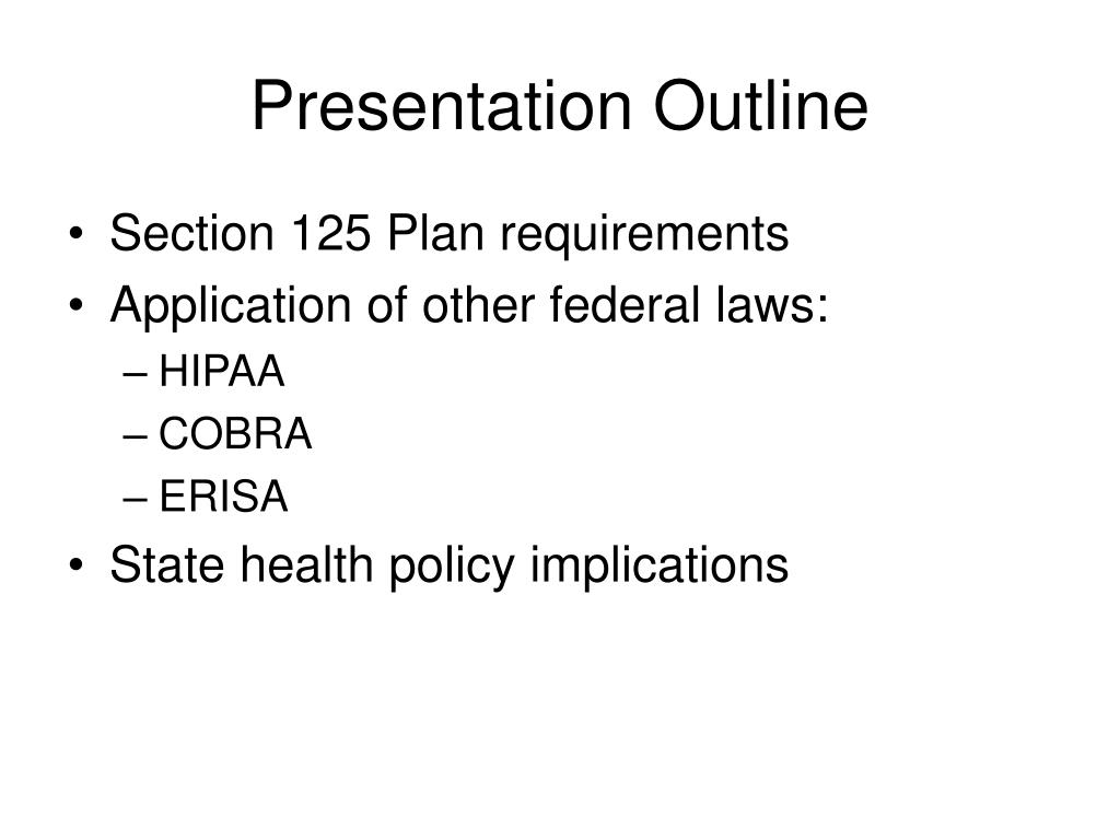 Presentation Outline • Section 125 Plan requirements • Application of other federal laws: • HIPAA • COBRA • ERISA • State health policy implications