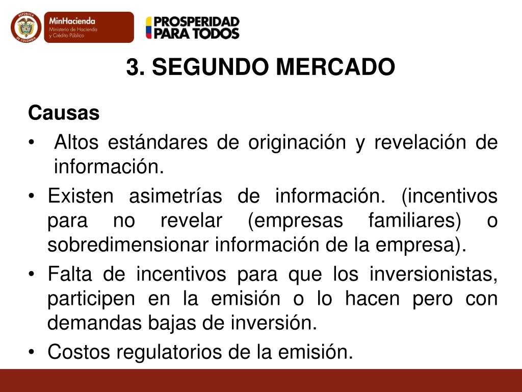 3. SEGUNDO MERCADO Causas Altos estándares de originación y revelación de información. Existen asimetrías de información. (incentivos para no revelar(empresas familiares) o sobredimensionar información de la empresa). Falta de incentivos para que los inversionistas, participen en la emisión o lo hacen pero con demandas bajas de inversión. Costos regulatorios de la emisión.