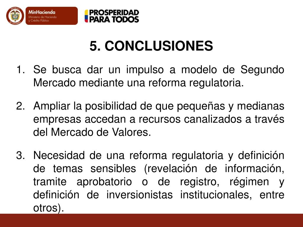 5. CONCLUSIONES Se busca dar un impulso a modelo de Segundo Mercado mediante una reforma regulatoria. Ampliar la posibilidad de que pequeñas y medianas empresas accedan a recursos canalizados a través del Mercado de Valores. Necesidad de una reforma regulatoria y definición de temas sensibles (revelación de información, tramite aprobatorio o de registro, régimen y definición de inversionistas institucionales, entre otros).