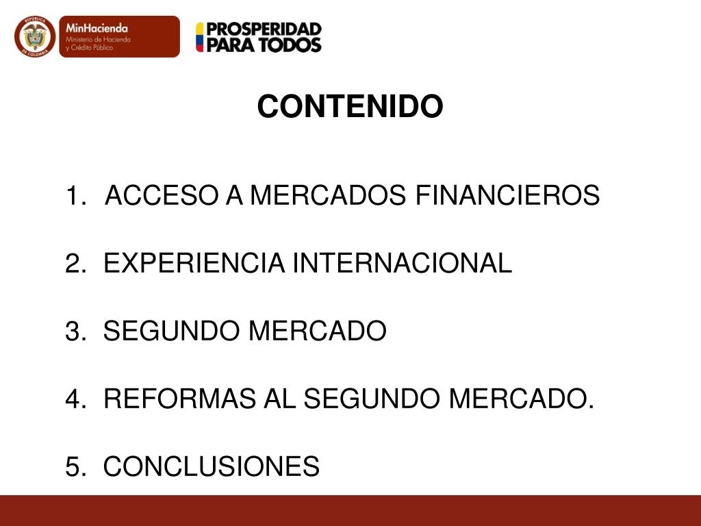 CONTENIDO ACCESO A MERCADOS FINANCIEROS 2. EXPERIENCIA INTERNACIONAL 3. SEGUNDO MERCADO 4. REFORMAS AL SEGUNDO MERCADO. 5. CONCLUSIONES