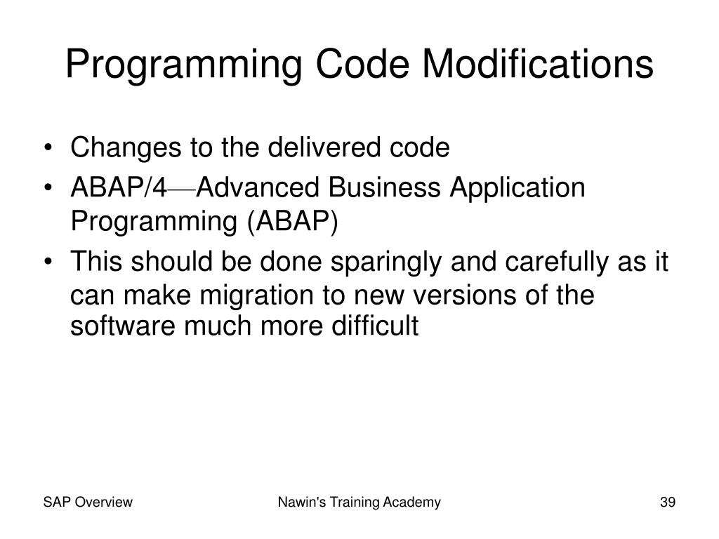 Programming Code Modifications • Changes to the delivered code • ABAP/4—Advanced Business Application Programming (ABAP) • This should be done sparingly and carefully as it can make migration to new versions of the software much more difficult Nawin's Training Academy