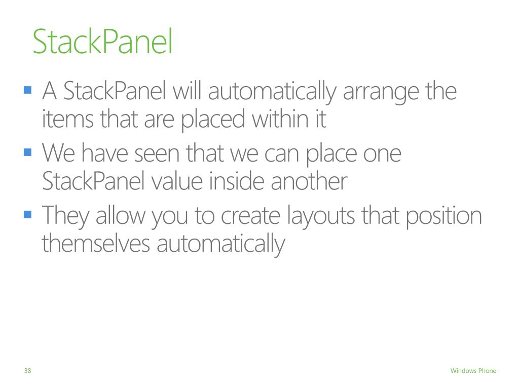StackPanel • A StackPanel will automatically arrange the items that are placed within it • We have seen that we can place one StackPanel value inside another • They allow you to create layouts that position themselves automatically