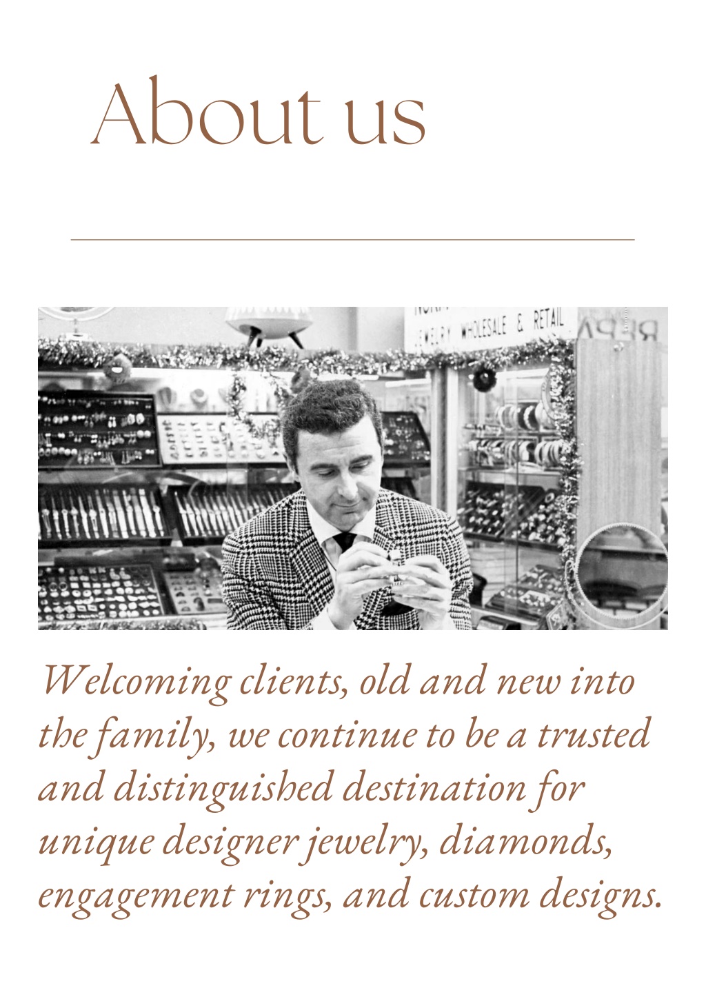 About us Welcoming clients, old and new into the family, we continue to be a trusted and distinguished destination for unique designer jewelry, diamonds, engagement rings, and custom designs.