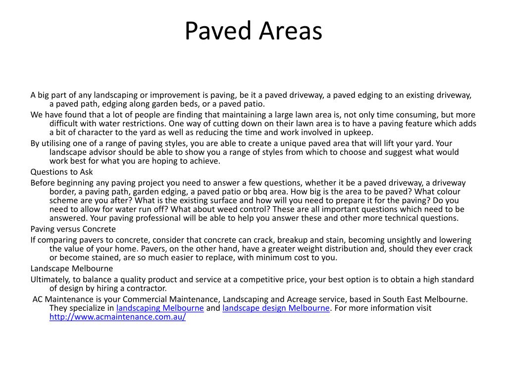 Paved Areas A big part of any landscaping or improvement is paving, be it a paved driveway, a paved edging to an existing driveway, a paved path, edging along garden beds, or a paved patio. We have found that a lot of people are finding that maintaining a large lawn area is, not only time consuming, but more difficult with water restrictions. One way of cutting down on their lawn area is to have a paving feature which adds a bit of character to the yard as well as reducing the time and work involved in upkeep. By utilising one of a range of paving styles, you are able to create a unique paved area that will lift your yard. Your landscape advisor should be able to show you a range of styles from which to choose and suggest what would work best for what you are hoping to achieve. Questions to Ask Before beginning any paving project you need to answer a few questions, whether it be a paved driveway, a driveway border, a paving path, garden edging, a paved patio or bbq area. How big is the area to be paved? What colour scheme are you after? What is the existing surface and how will you need to prepare it for the paving? Do you need to allow for water run off? What about weed control? These are all important questions which need to be answered. Your paving professional will be able to help you answer these and other more technical questions. Paving versus Concrete If comparing pavers to concrete, consider that concrete can crack, breakup and stain, becoming unsightly and lowering the value of your home. Pavers, on the other hand, have a greater weight distribution and, should they ever crack or become stained, are so much easier to replace, with minimum cost to you. Landscape Melbourne Ultimately, to balance a quality product and service at a competitive price, your best option is to obtain a high standard of design by hiring a contractor. AC Maintenance is your Commercial Maintenance, Landscaping and Acreage service, based in South East Melbourne. They specialize in landscaping Melbourne and landscape design Melbourne. For more information visit http://www.acmaintenance.com.au/