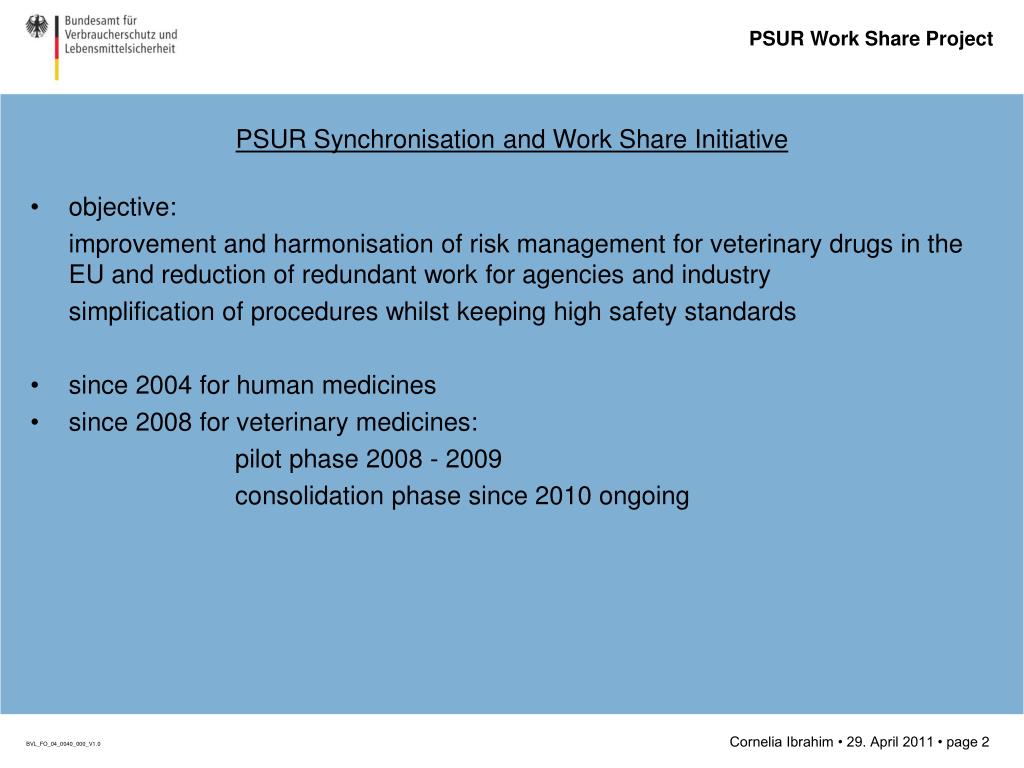 PSUR Work Share Project PSUR Synchronisation and Work Share Initiative • objective: improvement and harmonisation of risk management for veterinary drugs in the EU and reduction of redundant work for agencies and industry simplification of procedures whilst keeping high safety standards • since 2004 for human medicines • since 2008 for veterinary medicines: pilot phase 2008 - 2009 consolidation phase since 2010 ongoing