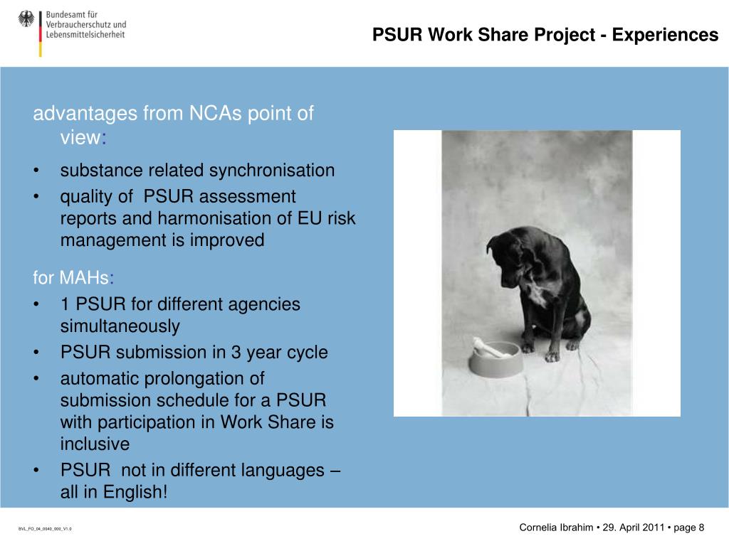 PSUR Work Share Project - Experiences advantages from NCAs point of view: • substance related synchronisation • quality of PSUR assessment reports and harmonisation of EU risk management is improved for MAHs: • 1 PSUR for different agencies simultaneously • PSUR submission in 3 year cycle • automatic prolongation of submission schedule for a PSUR with participation in Work Share is inclusive • PSUR not in different languages – all in English!