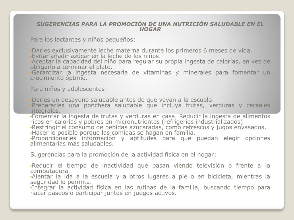 SUGERENCIAS PARA LA PROMOCIÓN DE UNA NUTRICIÓN SALUDABLE EN EL HOGAR Para los lactantes y niños pequeños: Darles exclusivamente leche materna durante los primeros 6 meses de vida. Evitar añadir azúcar en la leche de los niños. Aceptar la capacidad del niño para regular su propia ingesta de calorías, en vez de obligarlo a terminar el plato. Garantizar la ingesta necesaria de vitaminas y minerales para fomentar un crecimiento óptimo. Para niños y adolescentes: Darles un desayuno saludable antes de que vayan a la escuela. Prepararles una ponchera saludable que incluya frutas, verduras y cereales integrales. Fomentar la ingesta de frutas y verduras en casa. Reducir la ingesta de alimentos ricos en calorías y pobres en micronutrientes (refrigerios industrializados). Restringir el consumo de bebidas azucaradas, como refrescos y jugos envasados. Hacer lo posible porque las comidas se hagan en familia. Proporcionarles información y aptitudes para que puedan elegir opciones alimentarias más saludables. Sugerencias para la promoción de la actividad física en el hogar: Reducir el tiempo de inactividad que pasan viendo televisión o frente a la computadora. Alentar la ida a la escuela y a otros lugares a pie o en bicicleta, mientras la seguridad lo permita. Integrar la actividad física en las rutinas de la familia, buscando tiempo para hacer paseos o participar juntos en juegos activos.