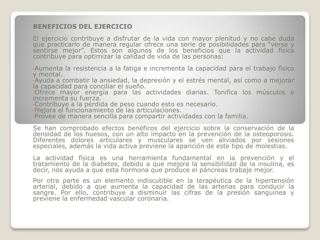 BENEFICIOS DEL EJERCICIO El ejercicio contribuye a disfrutar de la vida con mayor plenitud y no cabe duda que practicarlo de manera regular ofrece una serie de posibilidades para “verse y sentirse mejor”. Estos son algunos de los beneficios que la actividad física contribuye para optimizar la calidad de vida de las personas: Aumenta la resistencia a la fatiga e incrementa la capacidad para el trabajo físico y mental. Ayuda a combatir la ansiedad, la depresión y el estrés mental, así como a mejorar la capacidad para conciliar el sueño. Ofrece mayor energía para las actividades diarias. Tonifica los músculos e incrementa su fuerza. Contribuye a la pérdida de peso cuando esto es necesario. Mejora el funcionamiento de las articulaciones. Provee de manera sencilla para compartir actividades con la familia. Se han comprobado efectos benéficos del ejercicio sobre la conservación de la densidad de los huesos, con un alto impacto en la prevención de la osteoporosis. Diferentes dolores articulares y musculares se ven aliviados por sesiones especiales, además la vida activa previene la aparición de este tipo de molestias. La actividad física es una herramienta fundamental en la prevención y el tratamiento de la diabetes, debido a que mejora la sensibilidad de la insulina, es decir, nos ayuda a que esta hormona que produce el páncreas trabaje mejor. Por otra parte es un elemento indiscutible en la terapéutica de la hipertensión arterial, debido a que aumenta la capacidad de las arterias para conducir la sangre. Por ello, contribuye a disminuir las cifras de la presión sanguínea y previene la enfermedad vascular coronaria.