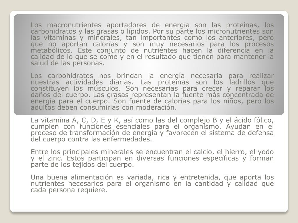 Los macronutrientes aportadores de energía son las proteínas, los carbohidratos y las grasas o lípidos. Por su parte los micronutrientes son las vitaminas y minerales, tan importantes como los anteriores, pero que no aportan calorías y son muy necesarios para los procesos metabólicos. Este conjunto de nutrientes hacen la diferencia en la calidad de lo que se come y en el resultado que tienen para mantener la salud de las personas. Los carbohidratos nos brindan la energía necesaria para realizar nuestras actividades diarias. Las proteínas son los ladrillos que constituyen los músculos. Son necesarias para crecer y reparar los daños del cuerpo. Las grasas representan la fuente más concentrada de energía para el cuerpo. Son fuente de calorías para los niños, pero los adultos deben consumirlas con moderación. La vitamina A, C, D, E y K, así como las del complejo B y el ácido fólico, cumplen con funciones esenciales para el organismo. Ayudan en el proceso de transformación de energía y favorecen el sistema de defensa del cuerpo contra las enfermedades. Entre los principales minerales se encuentran el calcio, el hierro, el yodo y el zinc. Estos participan en diversas funciones específicas y forman parte de los tejidos del cuerpo. Una buena alimentación es variada, rica y entretenida, que aporta los nutrientes necesarios para el organismo en la cantidad y calidad que cada persona requiere.