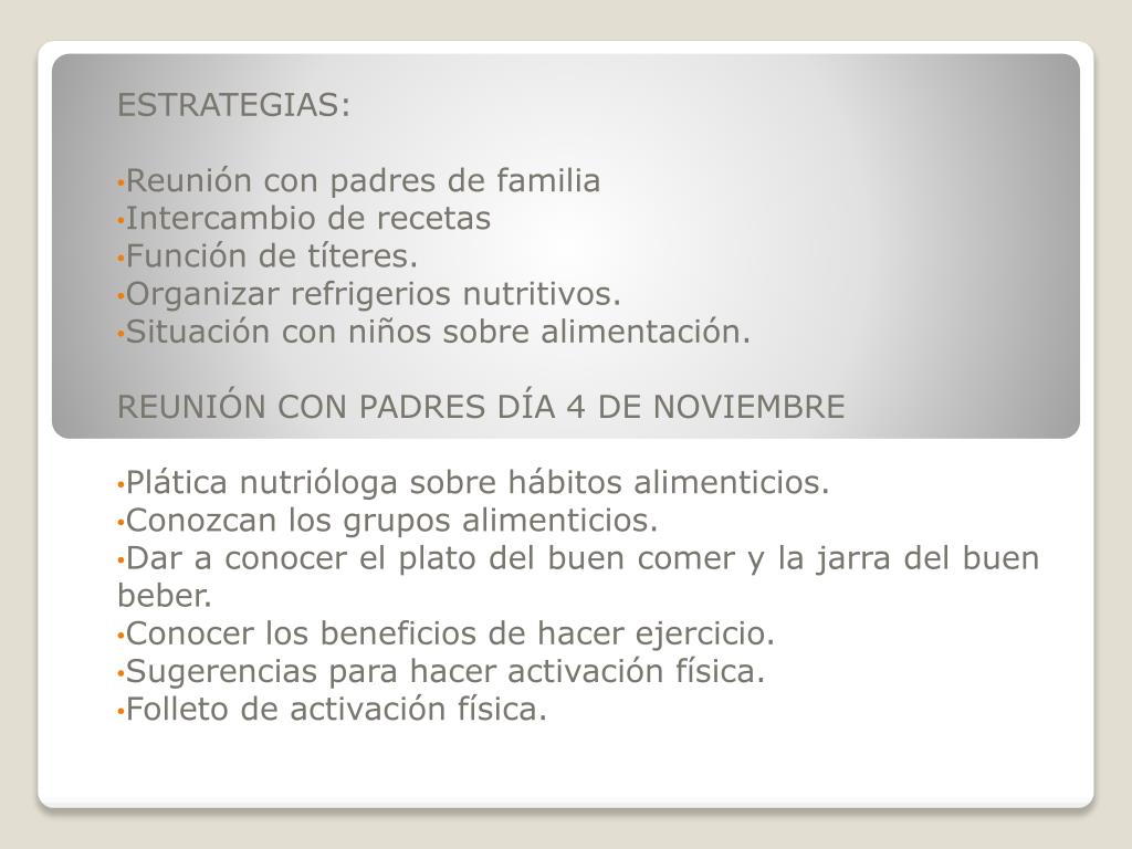 ESTRATEGIAS: Reunión con padres de familia Intercambio de recetas Función de títeres. Organizar refrigerios nutritivos. Situación con niños sobre alimentación. REUNIÓN CON PADRES DÍA 4 DE NOVIEMBRE Plática nutrióloga sobre hábitos alimenticios. Conozcan los grupos alimenticios. Dar a conocer el plato del buen comer y la jarra del buen beber. Conocer los beneficios de hacer ejercicio. Sugerencias para hacer activación física. Folleto de activación física.