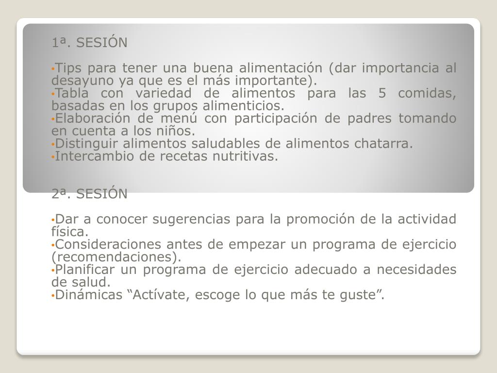 1ª. SESIÓN Tips para tener una buena alimentación (dar importancia al desayuno ya que es el más importante). Tabla con variedad de alimentos para las 5 comidas, basadas en los grupos alimenticios. Elaboración de menú con participación de padres tomando en cuenta a los niños. Distinguir alimentos saludables de alimentos chatarra. Intercambio de recetas nutritivas. 2ª. SESIÓN Dar a conocer sugerencias para la promoción de la actividad física. Consideraciones antes de empezar un programa de ejercicio (recomendaciones). Planificar un programa de ejercicio adecuado a necesidades de salud. Dinámicas “Actívate, escoge lo que más te guste”.