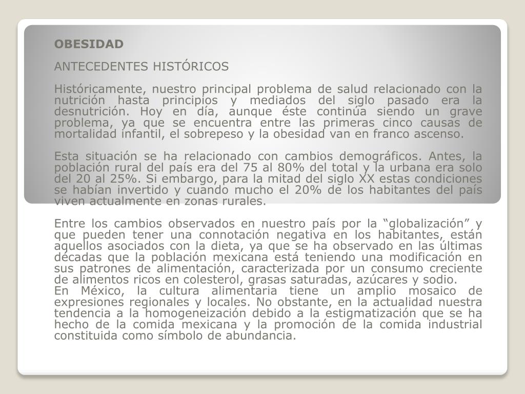 OBESIDAD ANTECEDENTES HISTÓRICOS Históricamente, nuestro principal problema de salud relacionado con la nutrición hasta principios y mediados del siglo pasado era la desnutrición. Hoy en día, aunque éste continúa siendo un grave problema, ya que se encuentra entre las primeras cinco causas de mortalidad infantil, el sobrepeso y la obesidad van en franco ascenso. Esta situación se ha relacionado con cambios demográficos. Antes, la población rural del país era del 75 al 80% del total y la urbana era solo del 20 al 25%. Si embargo, para la mitad del siglo XX estas condiciones se habían invertido y cuando mucho el 20% de los habitantes del país viven actualmente en zonas rurales. Entre los cambios observados en nuestro país por la “globalización” y que pueden tener una connotación negativa en los habitantes, están aquellos asociados con la dieta, ya que se ha observado en las últimas décadas que la población mexicana está teniendo una modificación en sus patrones de alimentación, caracterizada por un consumo creciente de alimentos ricos en colesterol, grasas saturadas, azúcares y sodio. En México, la cultura alimentaria tiene un amplio mosaico de expresiones regionales y locales. No obstante, en la actualidad nuestra tendencia a la homogeneización debido a la estigmatización que se ha hecho de la comida mexicana y la promoción de la comida industrial constituida como símbolo de abundancia.