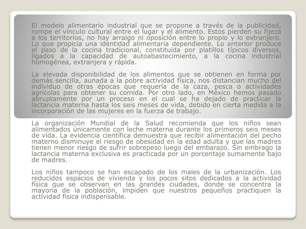 El modelo alimentario industrial que se propone a través de la publicidad, rompe el vínculo cultural entre el lugar y el alimento. Estos pierden su fijeza a los territorios, no hay arraigo ni oposición entre lo propio y lo extranjero. Lo que propicia una identidad alimentaria dependiente. Lo anterior produce el paso de la cocina tradicional, constituida por platillos típicos diversos, ligados a la capacidad de autoabastecimiento, a la cocina industrial homogénea, extranjera y rápida. La elevada disponibilidad de los alimentos que se obtienen en forma por demás sencilla, aunada a la pobre actividad física, nos distancian mucho del individuo de otras épocas que requería de la caza, pesca o actividades agrícolas para obtener su comida. Por otro lado, en México hemos pasado abruptamente por un proceso en el cual se ha dejado de practicar la lactancia materna hasta los seis meses de vida, debido en cierta medida a la incorporación de las mujeres en la fuerza de trabajo. La organización Mundial de la Salud recomienda que los niños sean alimentados únicamente con leche materna durante los primeros seis meses de vida. La evidencia científica demuestra que recibir alimentación del pecho materno disminuye el riesgo de obesidad en la edad adulta y que las madres tienen menor riesgo de sufrir sobrepeso luego del embarazo. Sin embrago la lactancia materna exclusiva es practicada por un porcentaje sumamente bajo de madres. Los niños tampoco se han escapado de los males de la urbanización. Los reducidos espacios de vivienda y los pocos sitos dedicados a la actividad física que se observan en las grandes ciudades, donde se concentra la mayoría de la población, impiden que nuestros pequeños practiquen la actividad física indispensable.