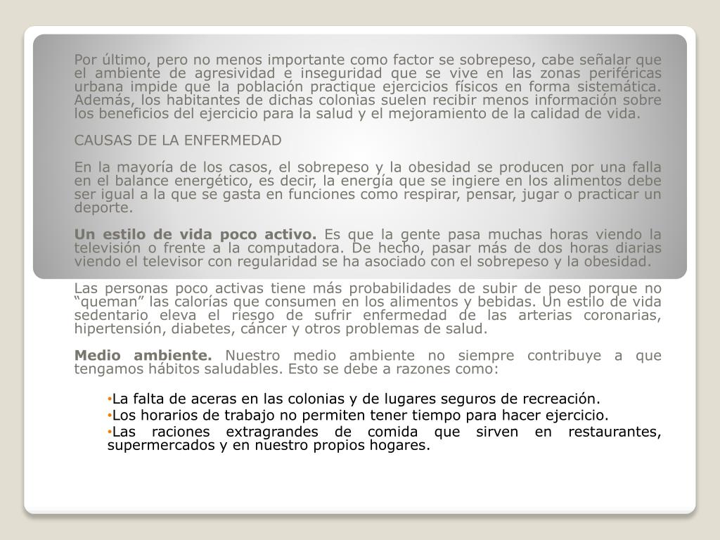 Por último, pero no menos importante como factor se sobrepeso, cabe señalar que el ambiente de agresividad e inseguridad que se vive en las zonas periféricas urbana impide que la población practique ejercicios físicos en forma sistemática. Además, los habitantes de dichas colonias suelen recibir menos información sobre los beneficios del ejercicio para la salud y el mejoramiento de la calidad de vida. CAUSAS DE LA ENFERMEDAD En la mayoría de los casos, el sobrepeso y la obesidad se producen por una falla en el balance energético, es decir, la energía que se ingiere en los alimentos debe ser igual a la que se gasta en funciones como respirar, pensar, jugar o practicar un deporte. Un estilo de vida poco activo. Es que la gente pasa muchas horas viendo la televisión o frente a la computadora. De hecho, pasar más de dos horas diarias viendo el televisor con regularidad se ha asociado con el sobrepeso y la obesidad. Las personas poco activas tiene más probabilidades de subir de peso porque no “queman” las calorías que consumen en los alimentos y bebidas. Un estilo de vida sedentario eleva el riesgo de sufrir enfermedad de las arterias coronarias, hipertensión, diabetes, cáncer y otros problemas de salud. Medio ambiente. Nuestro medio ambiente no siempre contribuye a que tengamos hábitos saludables. Esto se debe a razones como: La falta de aceras en las colonias y de lugares seguros de recreación. Los horarios de trabajo no permiten tener tiempo para hacer ejercicio. Las raciones extragrandes de comida que sirven en restaurantes, supermercados y en nuestro propios hogares.