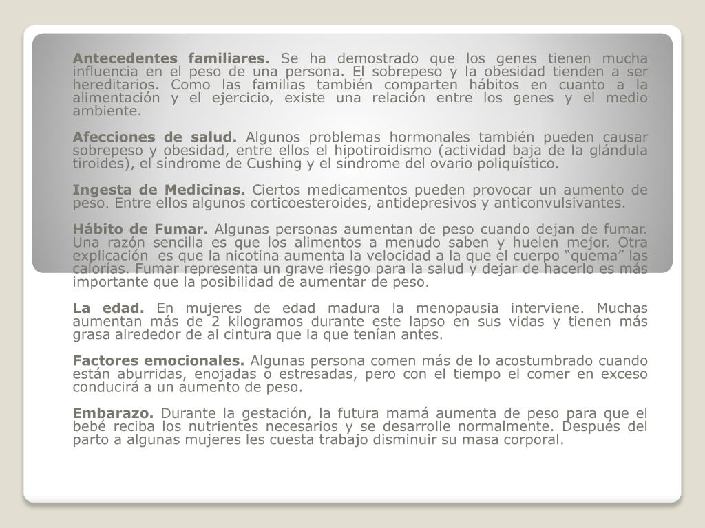 Antecedentes familiares. Se ha demostrado que los genes tienen mucha influencia en el peso de una persona. El sobrepeso y la obesidad tienden a ser hereditarios. Como las familias también comparten hábitos en cuanto a la alimentación y el ejercicio, existe una relación entre los genes y el medio ambiente. Afecciones de salud. Algunos problemas hormonales también pueden causar sobrepeso y obesidad, entre ellos el hipotiroidismo (actividad baja de la glándula tiroides), el síndrome de Cushing y el síndrome del ovario poliquístico. Ingesta de Medicinas. Ciertos medicamentos pueden provocar un aumento de peso. Entre ellos algunos corticoesteroides, antidepresivos y anticonvulsivantes. Hábito de Fumar. Algunas personas aumentan de peso cuando dejan de fumar. Una razón sencilla es que los alimentos a menudo saben y huelen mejor. Otra explicación es que la nicotina aumenta la velocidad a la que el cuerpo “quema” las calorías. Fumar representa un grave riesgo para la salud y dejar de hacerlo es más importante que la posibilidad de aumentar de peso. La edad. En mujeres de edad madura la menopausia interviene. Muchas aumentan más de 2 kilogramos durante este lapso en sus vidas y tienen más grasa alrededor de al cintura que la que tenían antes. Factores emocionales. Algunas persona comen más de lo acostumbrado cuando están aburridas, enojadas o estresadas, pero con el tiempo el comer en exceso conducirá a un aumento de peso. Embarazo. Durante la gestación, la futura mamá aumenta de peso para que el bebé reciba los nutrientes necesarios y se desarrolle normalmente. Después del parto a algunas mujeres les cuesta trabajo disminuir su masa corporal.