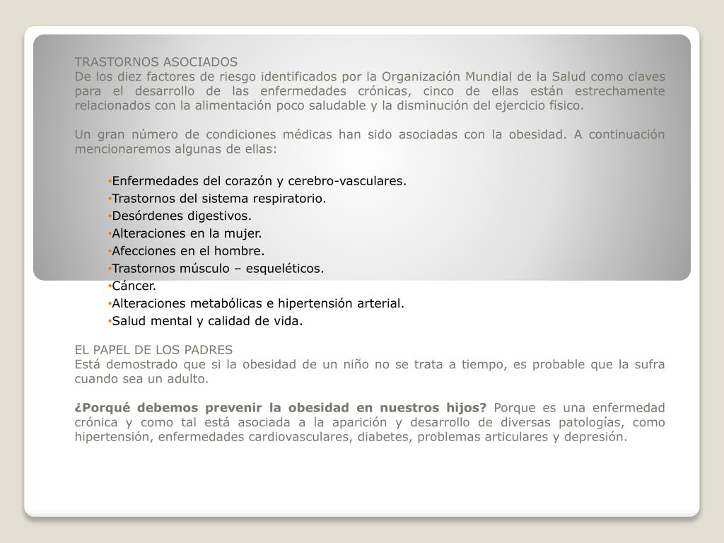 TRASTORNOS ASOCIADOS De los diez factores de riesgo identificados por la Organización Mundial de la Salud como claves para el desarrollo de las enfermedades crónicas, cinco de ellas están estrechamente relacionados con la alimentación poco saludable y la disminución del ejercicio físico. Un gran número de condiciones médicas han sido asociadas con la obesidad. A continuación mencionaremos algunas de ellas: Enfermedades del corazón y cerebro-vasculares. Trastornos del sistema respiratorio. Desórdenes digestivos. Alteraciones en la mujer. Afecciones en el hombre. Trastornos músculo – esqueléticos. Cáncer. Alteraciones metabólicas e hipertensión arterial. Salud mental y calidad de vida. EL PAPEL DE LOS PADRES Está demostrado que si la obesidad de un niño no se trata a tiempo, es probable que la sufra cuando sea un adulto. ¿Porqué debemos prevenir la obesidad en nuestros hijos? Porque es una enfermedad crónica y como tal está asociada a la aparición y desarrollo de diversas patologías, como hipertensión, enfermedades cardiovasculares, diabetes, problemas articulares y depresión.