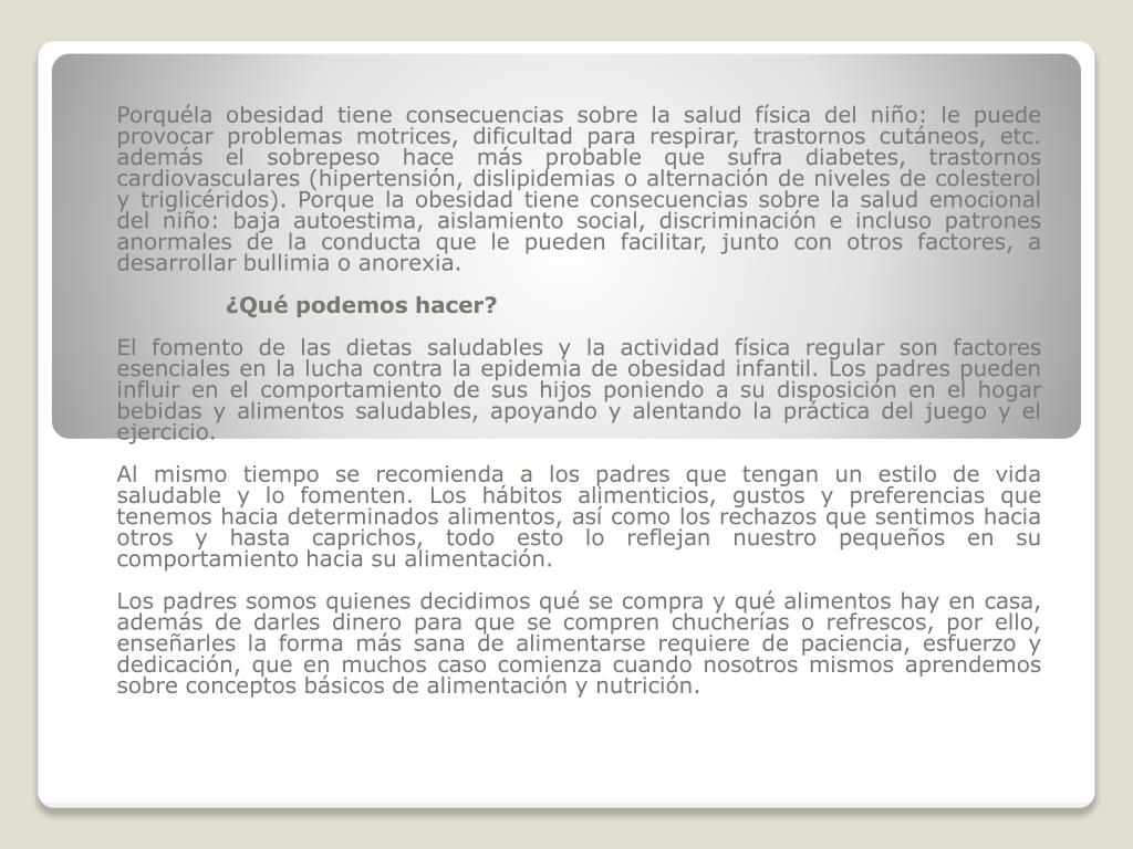Porquéla obesidad tiene consecuencias sobre la salud física del niño: le puede provocar problemas motrices, dificultad para respirar, trastornos cutáneos, etc. además el sobrepeso hace más probable que sufra diabetes, trastornos cardiovasculares (hipertensión, dislipidemias o alternación de niveles de colesterol y triglicéridos). Porque la obesidad tiene consecuencias sobre la salud emocional del niño: baja autoestima, aislamiento social, discriminación e incluso patrones anormales de la conducta que le pueden facilitar, junto con otros factores, a desarrollar bullimia o anorexia. ¿Qué podemos hacer? El fomento de las dietas saludables y la actividad física regular son factores esenciales en la lucha contra la epidemia de obesidad infantil. Los padres pueden influir en el comportamiento de sus hijos poniendo a su disposición en el hogar bebidas y alimentos saludables, apoyando y alentando la práctica del juego y el ejercicio. Al mismo tiempo se recomienda a los padres que tengan un estilo de vida saludable y lo fomenten. Los hábitos alimenticios, gustos y preferencias que tenemos hacia determinados alimentos, así como los rechazos que sentimos hacia otros y hasta caprichos, todo esto lo reflejan nuestro pequeños en su comportamiento hacia su alimentación. Los padres somos quienes decidimos qué se compra y qué alimentos hay en casa, además de darles dinero para que se compren chucherías o refrescos, por ello, enseñarles la forma más sana de alimentarse requiere de paciencia, esfuerzo y dedicación, que en muchos caso comienza cuando nosotros mismos aprendemos sobre conceptos básicos de alimentación y nutrición.