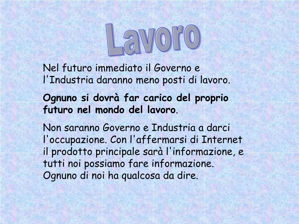 Lavoro Nel futuro immediato il Governo e l'Industria daranno meno posti di lavoro. Ognuno si dovrà far carico del proprio futuro nel mondo del lavoro. Non saranno Governo e Industria a darci l'occupazione. Con l'affermarsi di Internet il prodotto principale sarà l'informazione, e tutti noi possiamo fare informazione. Ognuno di noi ha qualcosa da dire.
