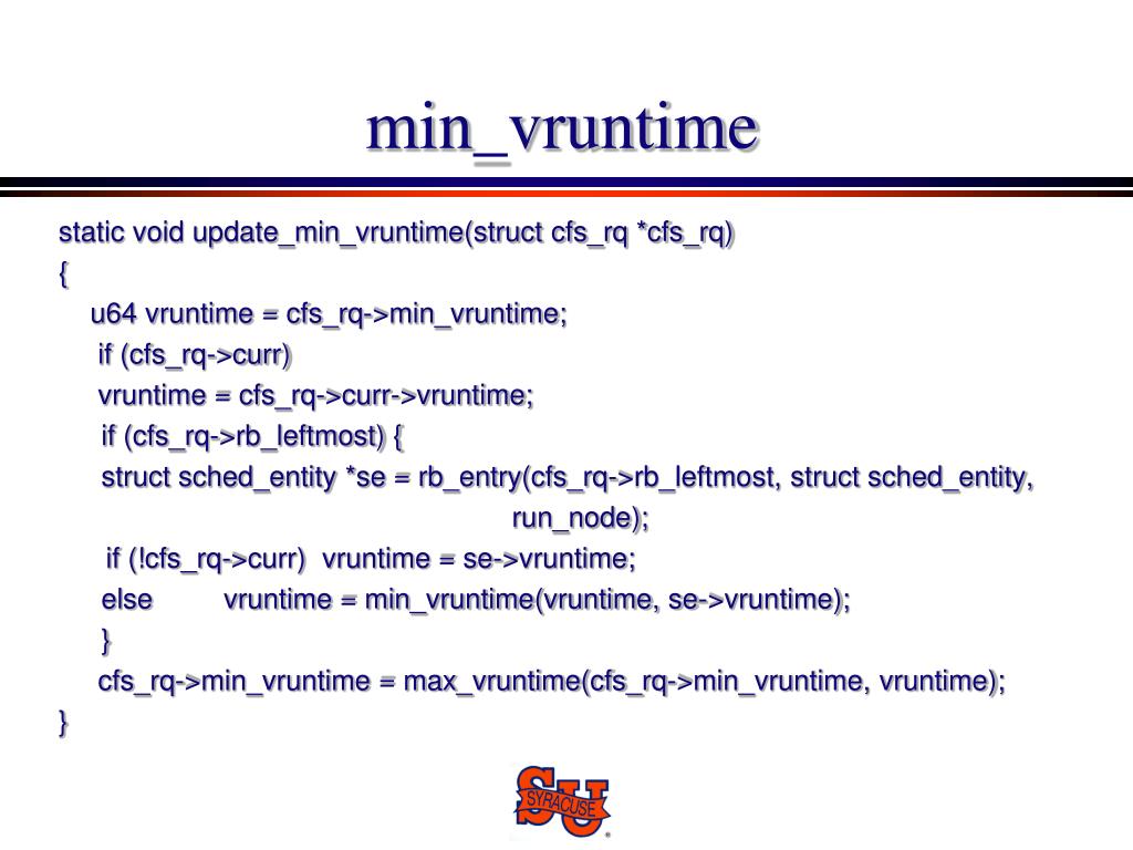 Vruntime kernel/sched_fair.c static inline void __update_curr(struct cfs_rq *cfs_rq, struct sched_entity *curr, unsigned long delta_exec) { unsigned long delta_exec_weighted; u64 vruntime; curr->sum_exec_runtime += delta_exec; ... delta_exec_weighted = delta_exec; if (unlikely(curr->load.weight != NICE_0_LOAD)) { delta_exec_weighted = calc_delta_fair(delta_exec_weighted, &curr->load); } curr->vruntime += delta_exec_weighted; ...