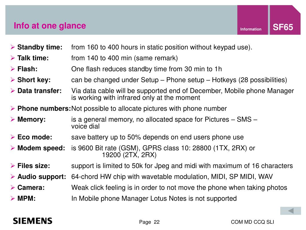 Information SF65 Info at one glance • Standby time: from 160 to 400 hours in static position without keypad use). • Talk time: from 140 to 400 min (same remark) • Flash: One flash reduces standby time from 30 min to 1h • Short key: can be changed under Setup – Phone setup – Hotkeys (28 possibilities) • Data transfer: Via data cable will be supported end of December, Mobile phone Manager is working with infrared only at the moment • Phone numbers: Not possible to allocate pictures with phone number • Memory: is a general memory, no allocated space for Pictures – SMS – voice dial • Eco mode: save battery up to 50% depends on end users phone use • Modem speed: is 9600 Bit rate (GSM), GPRS class 10: 28800 (1TX, 2RX) or 19200 (2TX, 2RX) • Files size: support is limited to 50k for Jpeg and midi with maximum of 16 characters • Audio support: 64-chord HW chip with wavetable modulation, MIDI, SP MIDI, WAV • Camera: Weak click feeling is in order to not move the phone when taking photos • MPM: In Mobile phone Manager Lotus Notes is not supported Page22 COM MD CCQ SLI