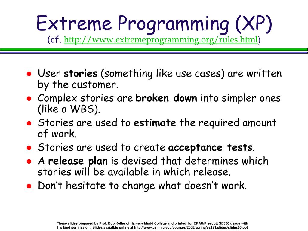 Extreme Programming (XP)(cf. http://www.extremeprogramming.org/rules.html) • User stories (something like use cases) are written by the customer. • Complex stories are broken down into simpler ones (like a WBS). • Stories are used to estimate the required amount of work. • Stories are used to create acceptance tests. • A release plan is devised that determines which stories will be available in which release. • Don’t hesitate to change what doesn’t work.