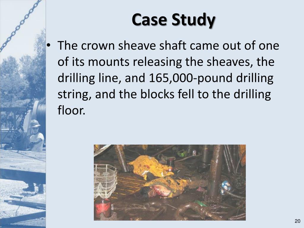 Case Study • The crown sheave shaft came out of one of its mounts releasing the sheaves, the drilling line, and 165,000-pound drilling string, and the blocks fell to the drilling floor.
