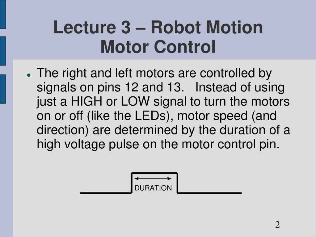 Lecture 3 – Robot MotionMotor Control • The right and left motors are controlled by signals on pins 12 and 13. Instead of using just a HIGH or LOW signal to turn the motors on or off (like the LEDs), motor speed (and direction) are determined by the duration of a high voltage pulse on the motor control pin. 2