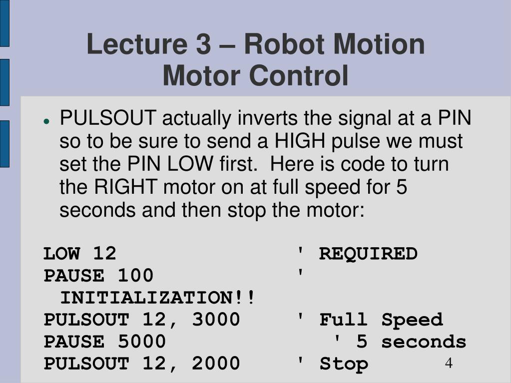 Lecture 3 – Robot MotionMotor Control • PULSOUT actually inverts the signal at a PIN so to be sure to send a HIGH pulse we must set the PIN LOW first. Here is code to turn the RIGHT motor on at full speed for 5 seconds and then stop the motor: LOW 12 ' REQUIRED PAUSE 100 ' INITIALIZATION!! PULSOUT 12, 3000 ' Full Speed PAUSE 5000 ' 5 seconds PULSOUT 12, 2000 ' Stop 4