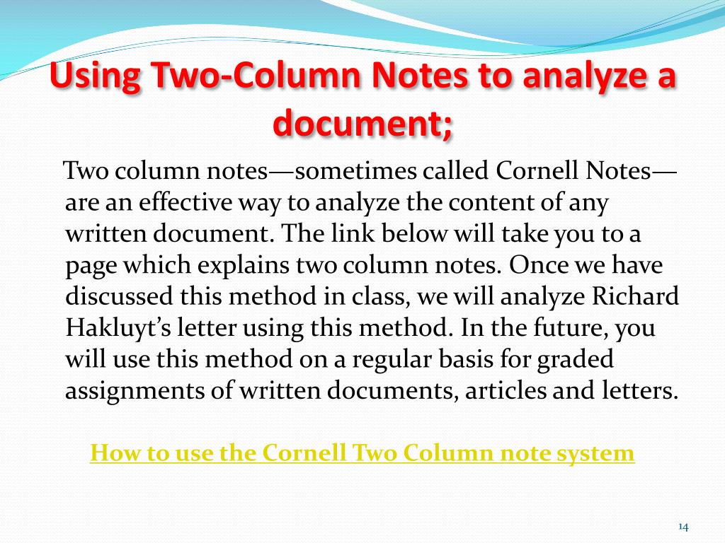 Using Two-Column Notes to analyze a document; Two column notes—sometimes called Cornell Notes—are an effective way to analyze the content of any written document. The link below will take you to a page which explains two column notes. Once we have discussed this method in class, we will analyze Richard Hakluyt’s letter using this method. In the future, you will use this method on a regular basis for graded assignments of written documents, articles and letters. How to use the Cornell Two Column note system