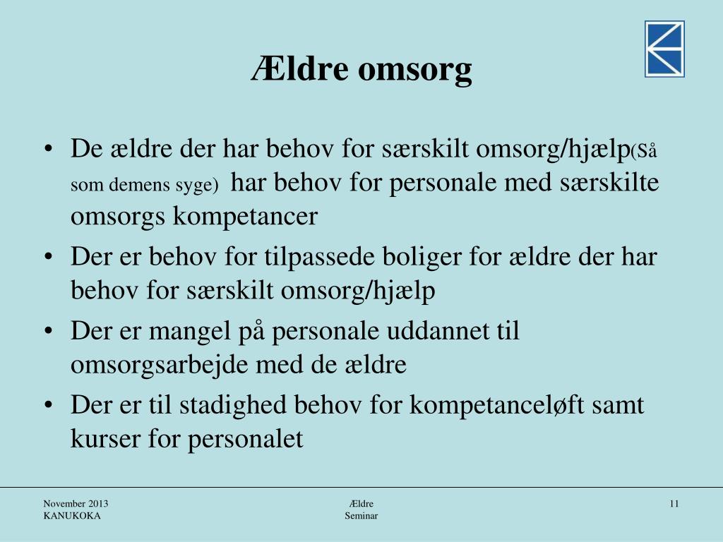 Ældre omsorg • De ældre der har behov for særskilt omsorg/hjælp(Så som demens syge) har behov for personale med særskilte omsorgs kompetancer • Der er behov for tilpassede boliger for ældre der har behov for særskilt omsorg/hjælp • Der er mangel på personale uddannet til omsorgsarbejde med de ældre • Der er til stadighed behov for kompetanceløft samt kurser for personalet Ældre Seminar