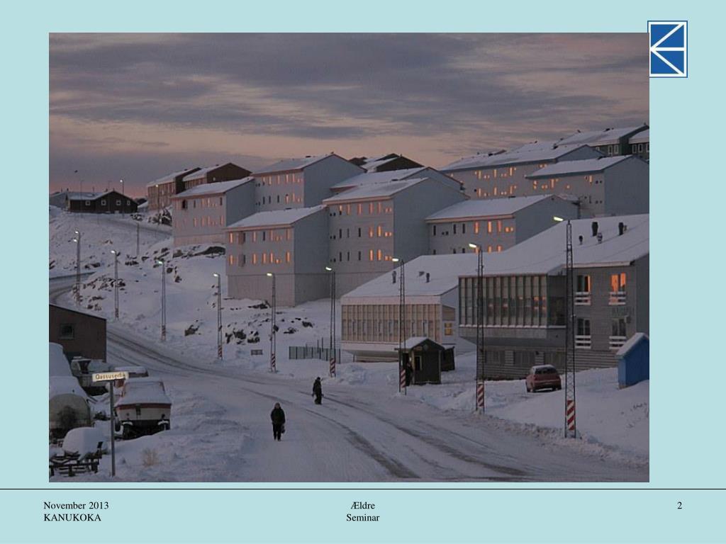 Om arbejdet med de ældre • Januar 2009 blev 18 kommuner Delt op i fire store kommuner • Kommune Kujalleq(Qaqortoq-Narsaq-Nanortalik+Bygder) • Kommuneqarfik Sermersooq(Nuuk-Paamiut-Tasiilaq- Ittoqqortoormiit+Bygder) • Qeqqata Kommunia (Sisimiut-Maniitsoq+Bygder) • Qaasuitsup Kommunia(Ilulissat-Aasiaat-Kangaatsiaq-Qasigiannguit-Qeqertarsuaq-Uummannaq-Upernavik-Qaanaaq • +Bygder Ældre Seminar