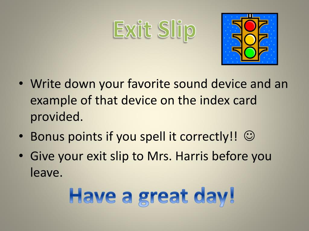 Exit Slip • Write down your favorite sound device and an example of that device on the index card provided. • Bonus points if you spell it correctly!! • Give your exit slip to Mrs. Harris before you leave. Have a great day!