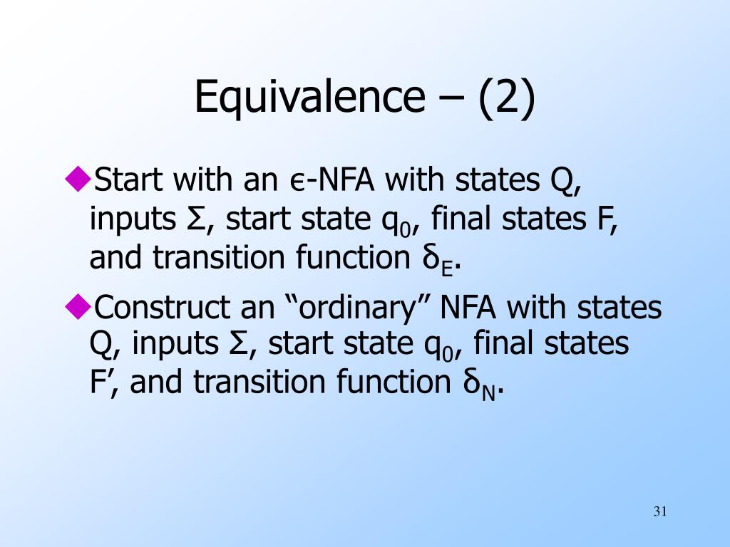 Equivalence – (2) • Start with an ε-NFA with states Q, inputs Σ, start state q0, final states F, and transition function δE. • Construct an “ordinary” NFA with states Q, inputs Σ, start state q0, final states F’, and transition function δN.