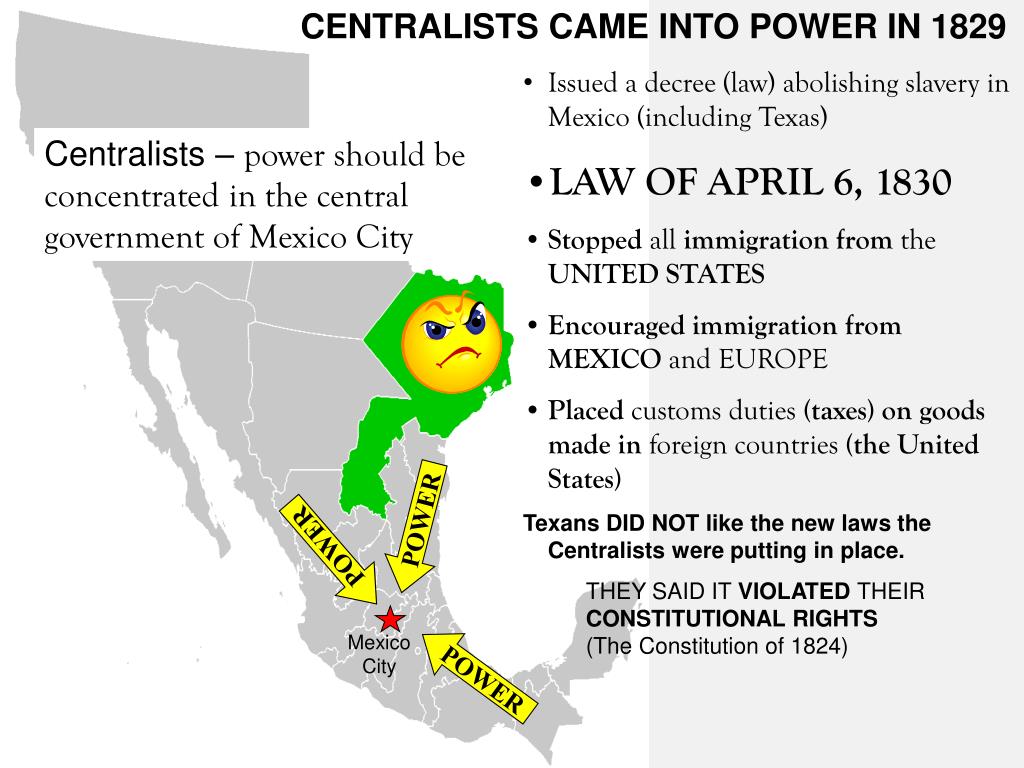 CENTRALISTS CAME INTO POWER IN 1829 • Issued a decree (law) abolishing slavery in Mexico (including Texas) • LAW OF APRIL 6, 1830 • Stopped all immigration from the UNITED STATES • Encouraged immigration from MEXICO and EUROPE • Placed customs duties (taxes) on goods made in foreign countries (the United States) • Texans DID NOT like the new laws the Centralists were putting in place. • THEY SAID IT VIOLATED THEIR CONSTITUTIONAL RIGHTS (The Constitution of 1824) Centralists – power should be concentrated in the central government of Mexico City POWER POWER POWER Mexico City