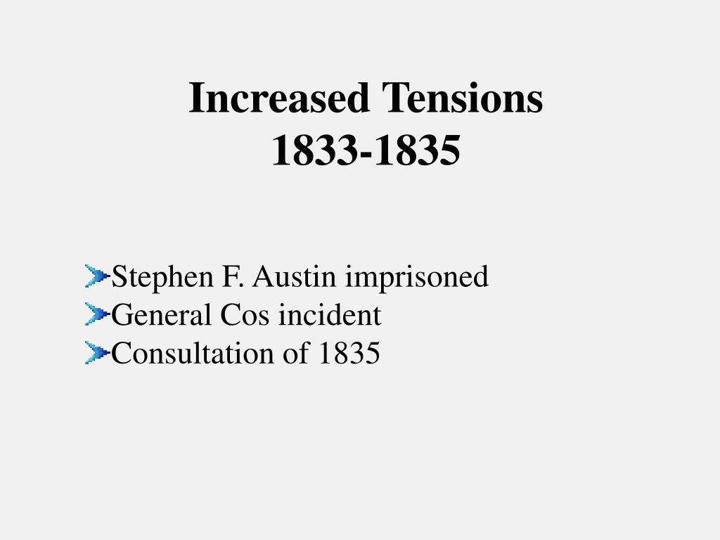 Increased Tensions 1833-1835 • Stephen F. Austin imprisoned • General Cos incident • Consultation of 1835