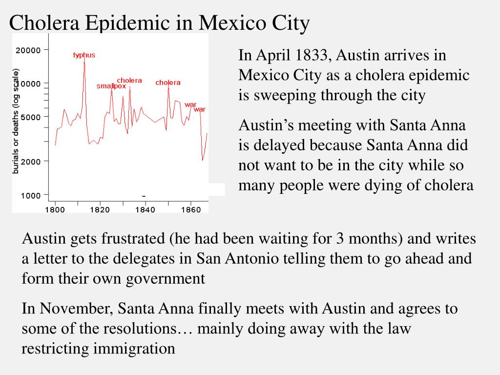 Cholera Epidemic in Mexico City In April 1833, Austin arrives in Mexico City as a cholera epidemic is sweeping through the city Austin’s meeting with Santa Anna is delayed because Santa Anna did not want to be in the city while so many people were dying of cholera Austin gets frustrated (he had been waiting for 3 months) and writes a letter to the delegates in San Antonio telling them to go ahead and form their own government In November, Santa Anna finally meets with Austin and agrees to some of the resolutions… mainly doing away with the law restricting immigration