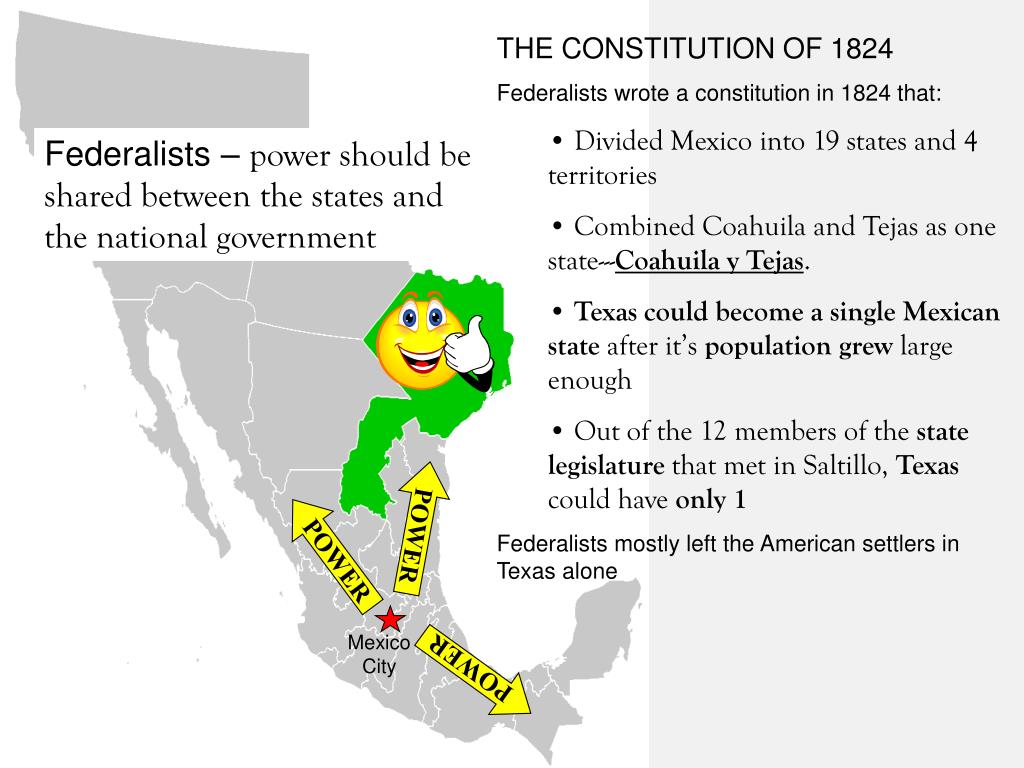 THE CONSTITUTION OF 1824 • Federalists wrote a constitution in 1824 that: • Divided Mexico into 19 states and 4 territories • Combined Coahuila and Tejas as one state---Coahuila y Tejas. • Texas could become a single Mexican state after it’s population grew large enough • Out of the 12 members of the state legislature that met in Saltillo, Texas could have only 1 • Federalists mostly left the American settlers in Texas alone Federalists – power should be shared between the states and the national government POWER POWER POWER Mexico City