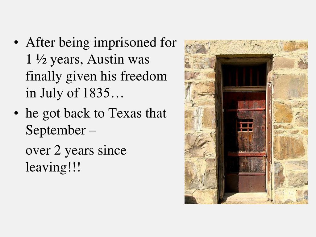After being imprisoned for 1 ½ years, Austin was finally given his freedom in July of 1835… • he got back to Texas that September – over 2 years since leaving!!!
