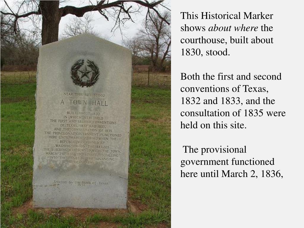 This Historical Marker shows about where the courthouse, built about 1830, stood. Both the first and second conventions of Texas, 1832 and 1833, and the consultation of 1835 were held on this site. The provisional government functioned here until March 2, 1836,