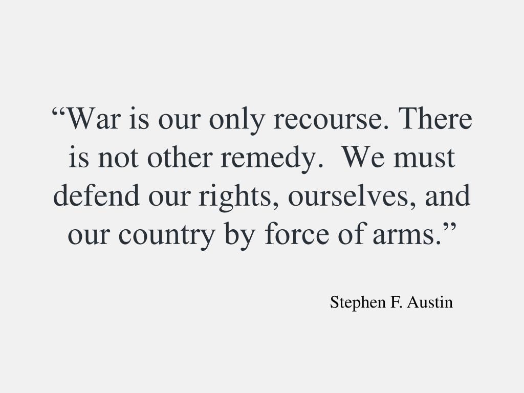 “War is our only recourse. There is not other remedy. We must defend our rights, ourselves, and our country by force of arms.” Stephen F. Austin